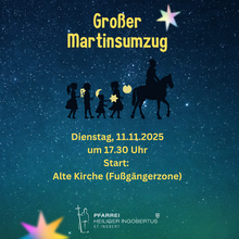 Der diesjährige Martinsumzug findet am Dienstag, 11. November, statt. Wir treffen uns um 17.30 Uhr an der Alten Kirche und gehen dann mit unseren Laternen durch die Gustav-Clauss-Anlage auf das Gelände der ehemaligen Tischtennishalle. Der heilige Martin wird mit uns auf seinem Pferd unterwegs sein. Das Martinsfeuer wird von den Pfadfindern entzündet. Die Feuerwehr sorgt für Punsch, Glühwein und Rostwürstchen. Und für leckere Martinsbrezeln ist auch gesorgt. Das Mitbringen von Fackeln ist aus Sicherheitsgründen untersagt. Der Bonverkauf für die Martinsbrezeln (3 €) findet zu den Öffnungszeiten im Pfarrbüro vom 3. bis 7. November statt. | Gemeindereferentin Melanie Viehl