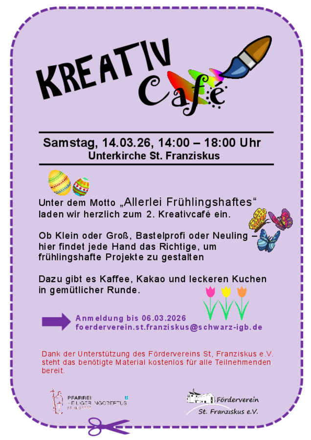 Nach dem großen Erfolg im November 2025 laden wir zum 2. Kreativcafé ein! Kreativ sein, gemeinsam basteln, Schönes herstellen und dabei bei Kaffee, Kakao und einem leckeren Stück Kuchen gemütlich zusammensitzen. Das alles erwartet Sie auch im 2. Kreativcafé in der Unterkirche. Am Samstag, den 14. März, 14 bis 18 Uhr, öffnet unser Kreativcafé erneut seine Türen – diesmal unter dem Motto „Allerlei Frühlingshaftes“. Ob ganz einfache Idee oder etwas knifflige Projekte – für jeden und jede ist etwas dabei. Egal ob klein oder groß, jung oder älter, Bastelprofi oder Anfänger: Hier findet jede Hand das Richtige, um kleine Kostbarkeiten zu gestalten. Der Duft von frischem Kuchen, Kaffee und Kakao begleitet die Bastelstunden und sorgt für gemütliche Pausen zwischendurch. Dank der Unterstützung des Fördervereins St. Franziskus e. V. steht das Material kostenlos für alle Teilnehmenden bereit.