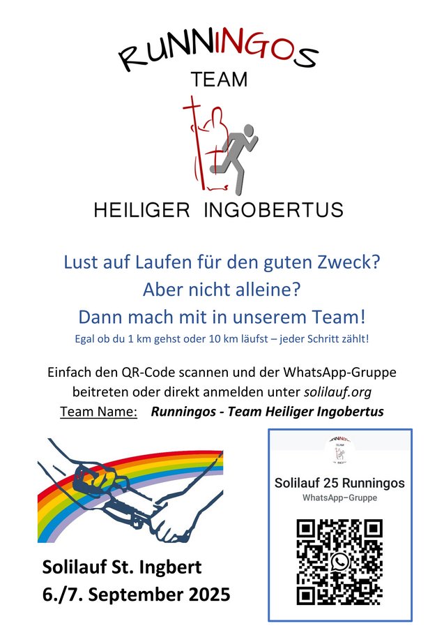 Gemeinsam Laufen für den guten Zweck: Die Runningos beim 20. Solilauf in St. Ingbert. Auch in diesem Jahr nimmt unsere Laufgruppe Runningos am Solilauf teil – und wir freuen uns über jede Unterstützung! Der Solilauf ist nicht nur ein sportliches Event, sondern ein starkes Zeichen für Solidarität, Toleranz und Zusammenhalt. Ob Anfänger*in oder geübter Läufer*in – jede Runde zählt! Wer mit uns laufen möchte, kann sich ab sofort bei solilauf.org anmelden. Alle näheren Informationen erhaltet ihr in unserer WhatsApp-Gruppe oder im Pfarrbüro. Wir freuen uns auf viele motivierte Mitläuferinnen und Mitläufer!