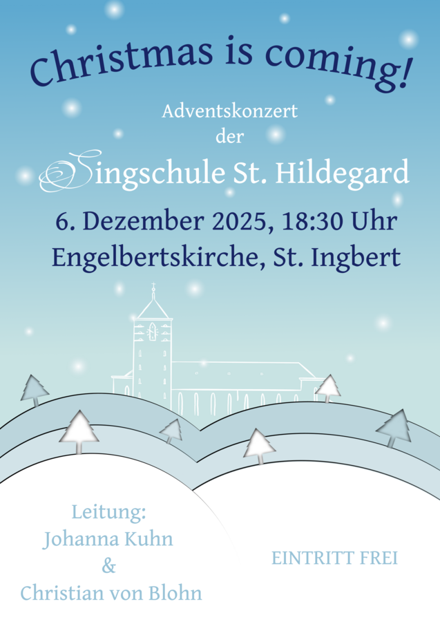 Christmas is coming! Die Weihnachtszeit steht vor der Tür und – getreu ihrem diesjährigen Motto „Christmas is coming“ – lädt die Singschule St. Hildegard zu ihrem traditionellen Adventskonzert ein. Dazu werden am 6. Dezember um 18.30 Uhr in der Engelbertskirche die musikalischen Talente beider Chöre der Singschule ihre Stimmen erklingen lassen.