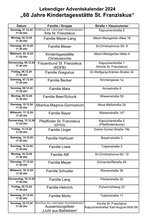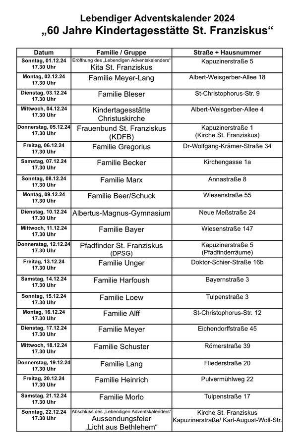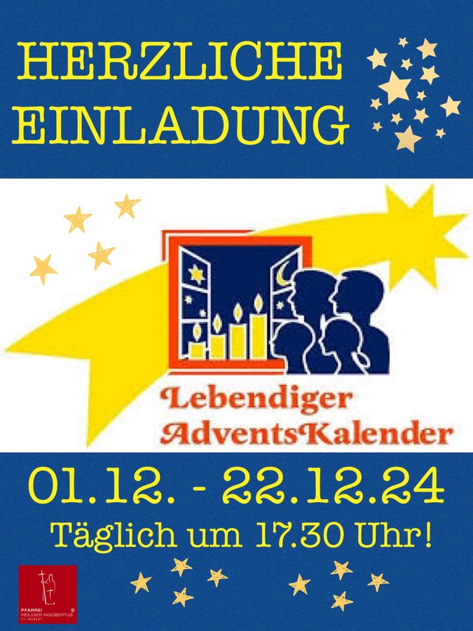 In diesem Jahr gibt es wieder einen „Lebendigen Adventskalender“! Vom 1. bis 22. Dezember öffnen sich Türen und Fenster bei verschiedenen Familien, Gruppen und Kindergärten. Beginn ist jeweils um 17.30 Uhr.